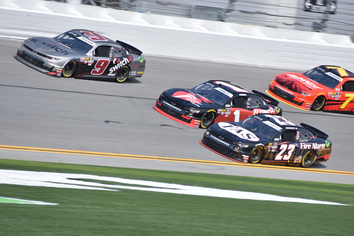 DSC_0761 Noah Gragson (9) leads the top groove and close of clearing Michael Annett (1) and John Hunter Nemechek (23).